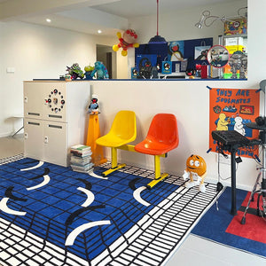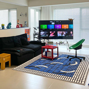Elevate your interior with this dopamine-inspired blue rug, designed to bring energy and modern charm to any living space. Featuring bold curved lines over a vibrant grid background, it blends playful design with practical comfort. Crafted from soft plush material with a durable anti-slip backing, this rug stays in place and adds warmth underfoot. Ideal for living rooms, dorms, or creative studios, it’s easy to clean and maintain. Whether placed under a coffee table or as a centerpiece, this rug is perfect for anyone looking to add a pop of personality and a touch of artful expression to their home.