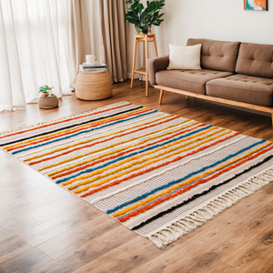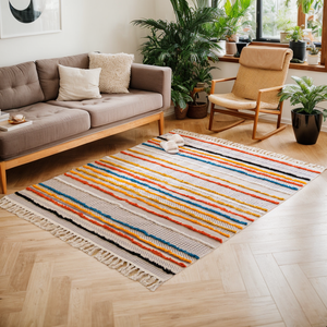 Add a splash of color and texture to your home with this Boho Striped Cotton-Linen Rug. Featuring handwoven multicolor stripes and soft tassel edges, it brings a warm, cozy, and casual charm to any space. Perfect for the living room, bedroom, tea area, or bedside, this rug is made from a breathable cotton-linen blend and is machine washable for easy care. Lightweight yet durable, it doubles as a decorative accent and functional floor mat. Whether you're going for a minimalist natural style or a colorful bohemian vibe, this rug offers comfort, versatility, and timeless appeal.
