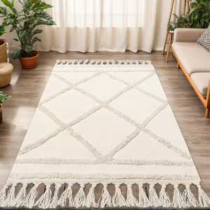 Create a calm and cozy atmosphere with this Boho Tassel Cotton Rug. Handwoven with soft cotton fibers, it features a subtle diamond pattern and fringe detailing that adds warmth and charm to any space. Ideal for living rooms, bedrooms, bathrooms, or guesthouses, this rug is both stylish and practical. Its lightweight design is easy to clean and machine washable, making it perfect for modern lifestyles. The natural beige tone complements rustic, Scandinavian, and minimalist interiors alike. Soft underfoot and timeless in design, it’s a beautiful way to add texture and elegance to your home.