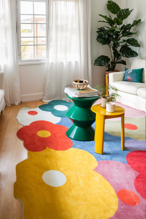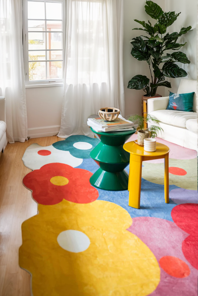 Elevate your space with funky area rugs featuring a vibrant floral pattern in an irregular shape. This multi-color rug adds a touch of nature, infusing artistic flair with its unconventional shape. Pet-friendly, washable, and non-slip, it seamlessly blends style and practicality—perfect for those seeking unique, fun-shaped rugs that are both stylish and functional for home decor.