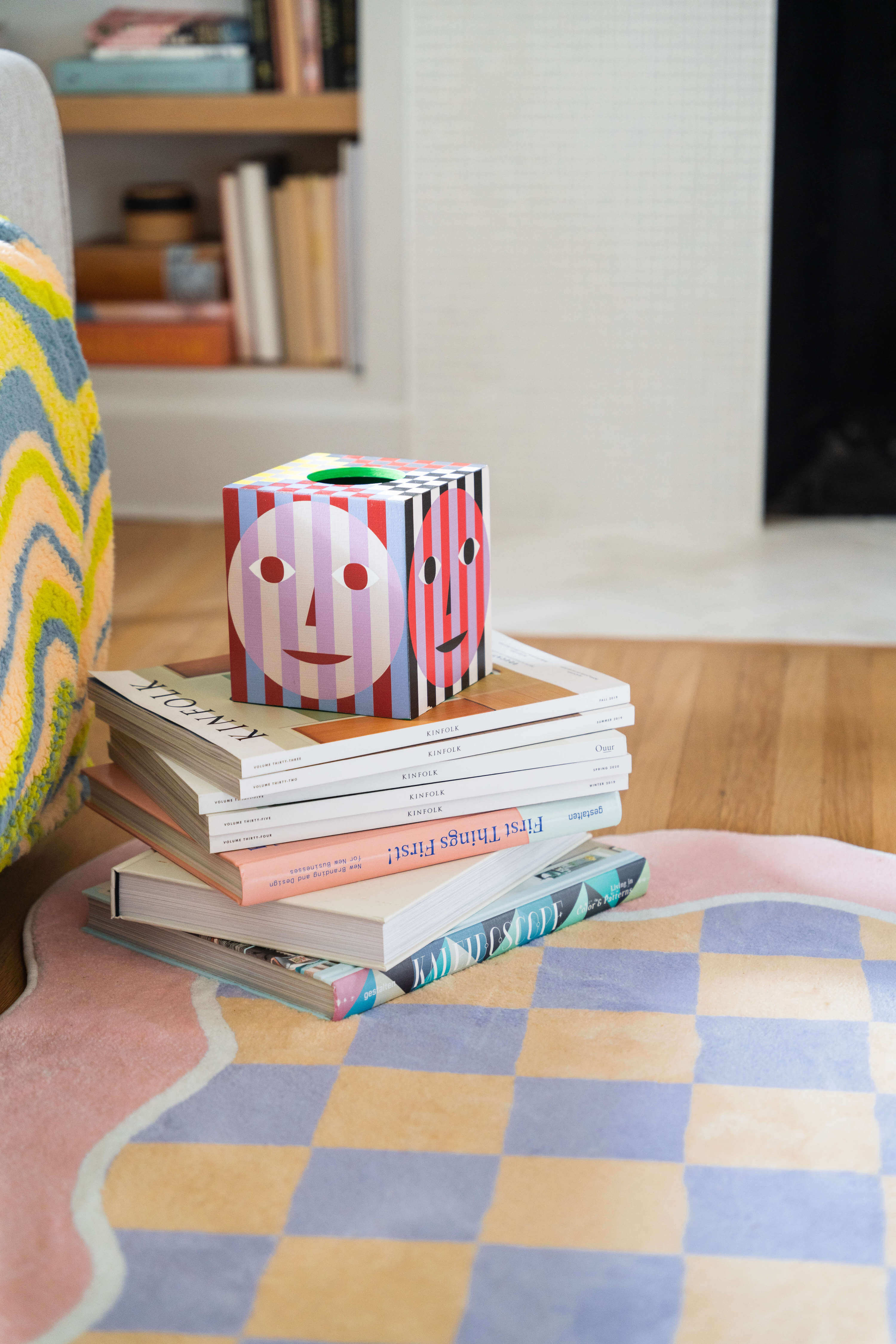 A cute, pastel rug boasting a yellow and purple checkered rug, accented by a charming pink wavy border. It offers the practicality of making this multi color rug both visually appealing and functional. This rug is a perfect addition to any space with its playful design and practical features.