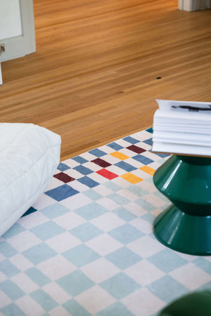 This geometric checkered rug features a soft blue and white center, gradually transitioning to vibrant multicolored squares along the edges. The pixelated pattern creates a unique, dynamic effect, perfect for adding a pop of color and style to your living room or bedroom. Available in 5' x 7' and 7' x 10' sizes, it combines modern design with a playful twist, making it an eye-catching addition to any space.
