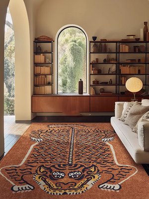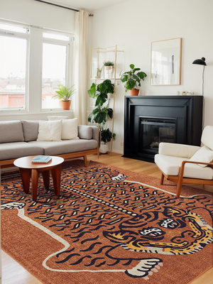 Make a bold statement with this Vintage Tibetan Tiger Rug, inspired by traditional Himalayan artistry. Featuring a symbolic tiger motif believed to bring strength and protection, this rug blends spiritual meaning with striking visual appeal. Its rich texture and warm earth tones make it perfect for living rooms, bedrooms, reading corners, or meditation areas. Crafted from premium materials with an antique-style finish, this piece functions as both a cozy floor covering and a cultural artwork. Ideal for eclectic, bohemian, or East-meets-West interiors, it adds character, depth, and a touch of mystique to any space.