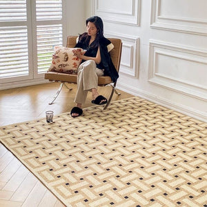 Add a touch of timeless charm with this vintage woven grid rug. The neutral tones and subtle pattern echo classic European elegance, effortlessly enhancing both modern and traditional interiors. Crafted for comfort and durability, it’s perfect for high-traffic areas like living rooms or studios. The understated checkered layout adds structure without overwhelming the space, making it ideal for those who love refined minimalism. Whether you're styling a boutique apartment or a cozy lounge, this rug brings harmony, warmth, and a polished finish to your décor.